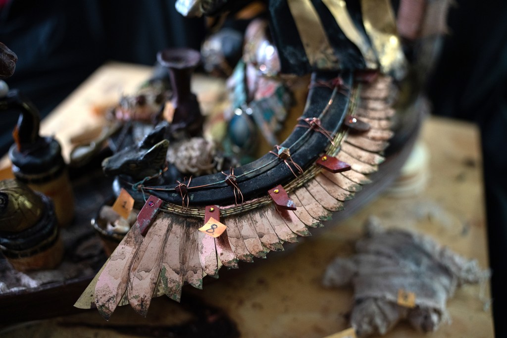 2022. 19″h x 32″w. Wood, polymer clay, fabric, wire, paper, beads, acrylic, earthen clay, resin, watercolor, plywood, foam core.