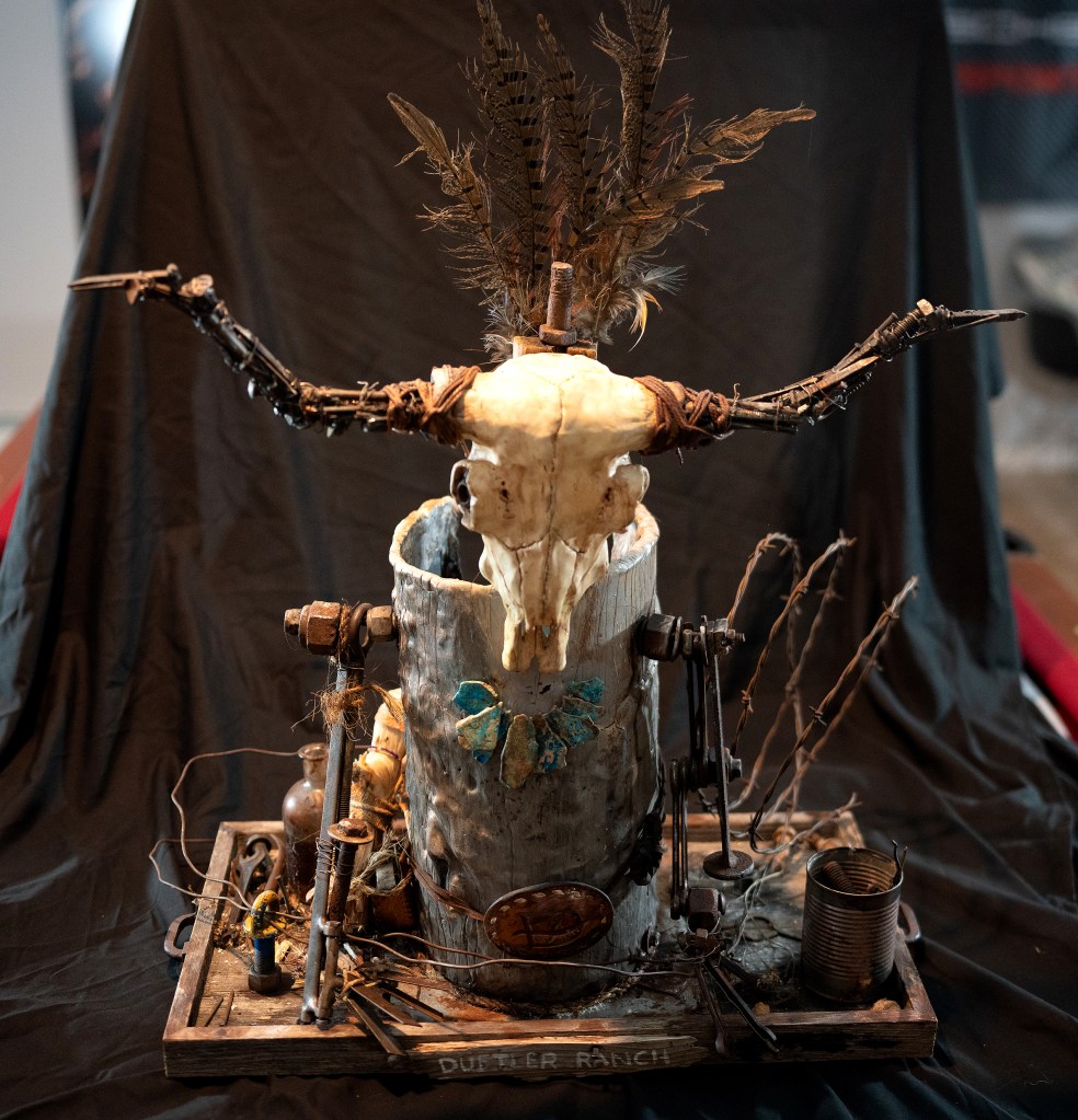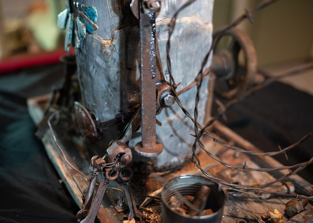 2022. 28″h x 24″w. Wood, metal, polymer clay, fabric, iron, tin, feathers, resin, wire