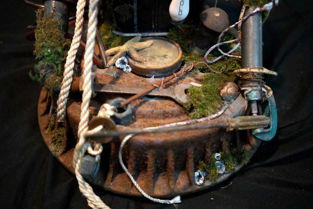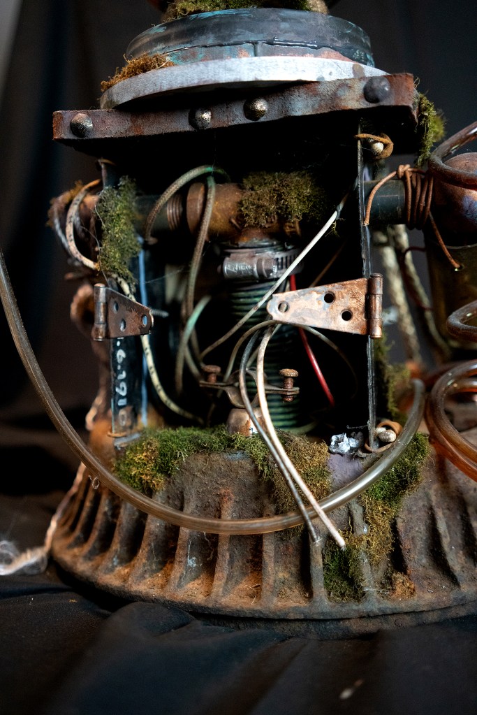 2021. 20″h x 17″w. Iron, steel, glass, plastic, wire, rope, lightbulb, moss, acrylic.