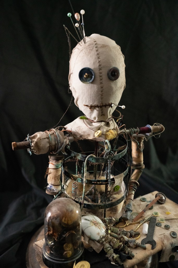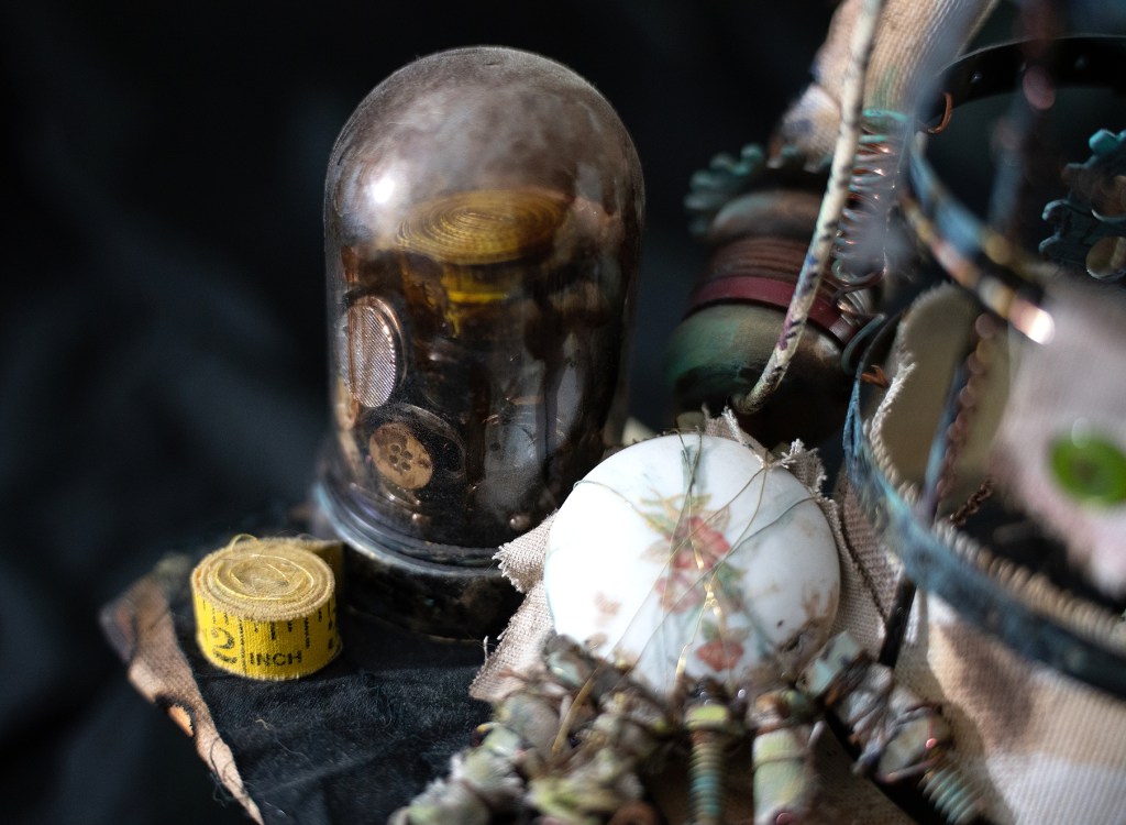 2021. 15″h x 10″w. Wood, buttons, plastic, foam, fabric, steel, ceramic, wire.
