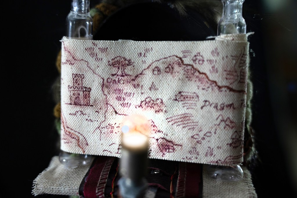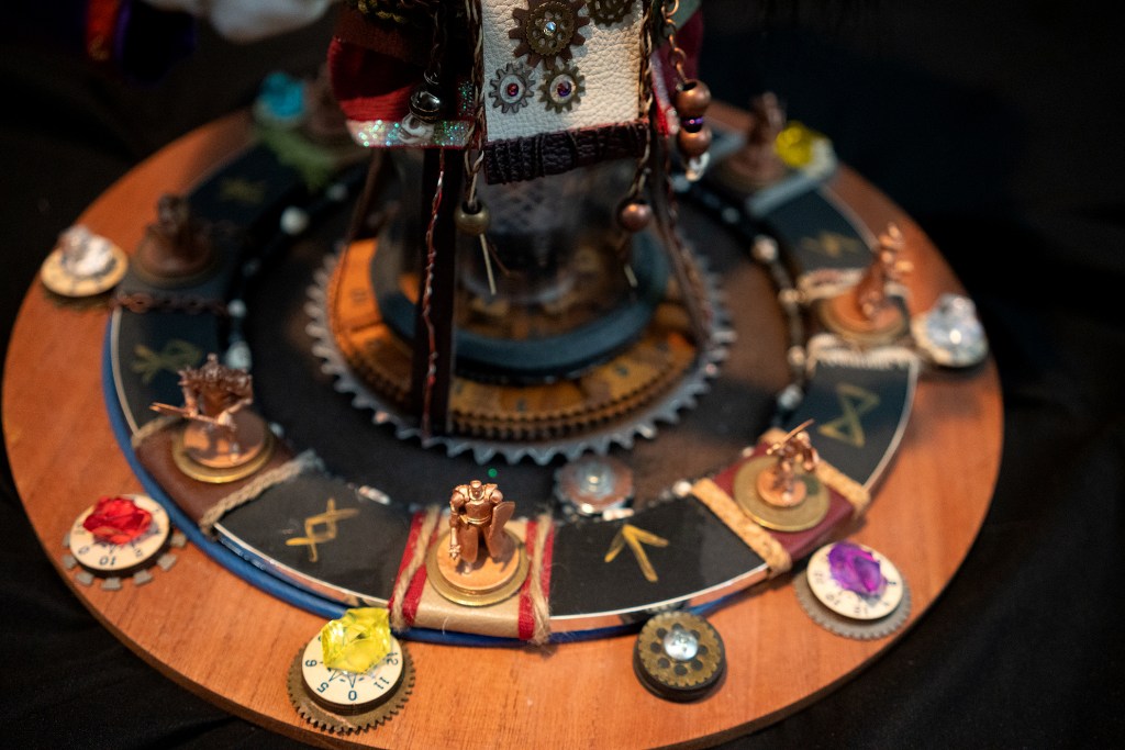 2021. 22″h x 16″w. Wood, wire, polymer clay, fabric, plastic, beads, canvas, watercolor, acrylic, leather, glass.