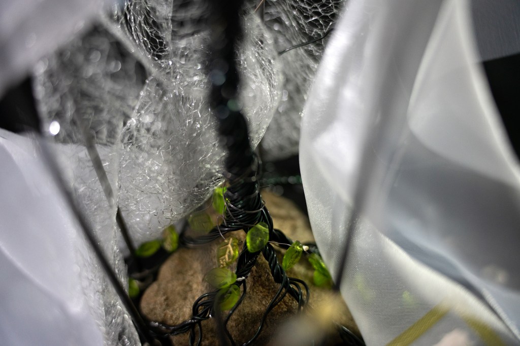 2022. 18″h x 14″w. Wire, fabric, paper, ink, acrylic, glass beads, wood.